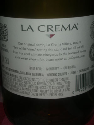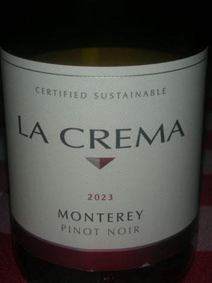(date entered Apr.9, 2025) This, 2023 bottled, Pinot Noir is a lower end of La Crema. Still, it is a good wine with dinner of chicken or fish, even Steakies! You can get it around $10 if you look hard.
